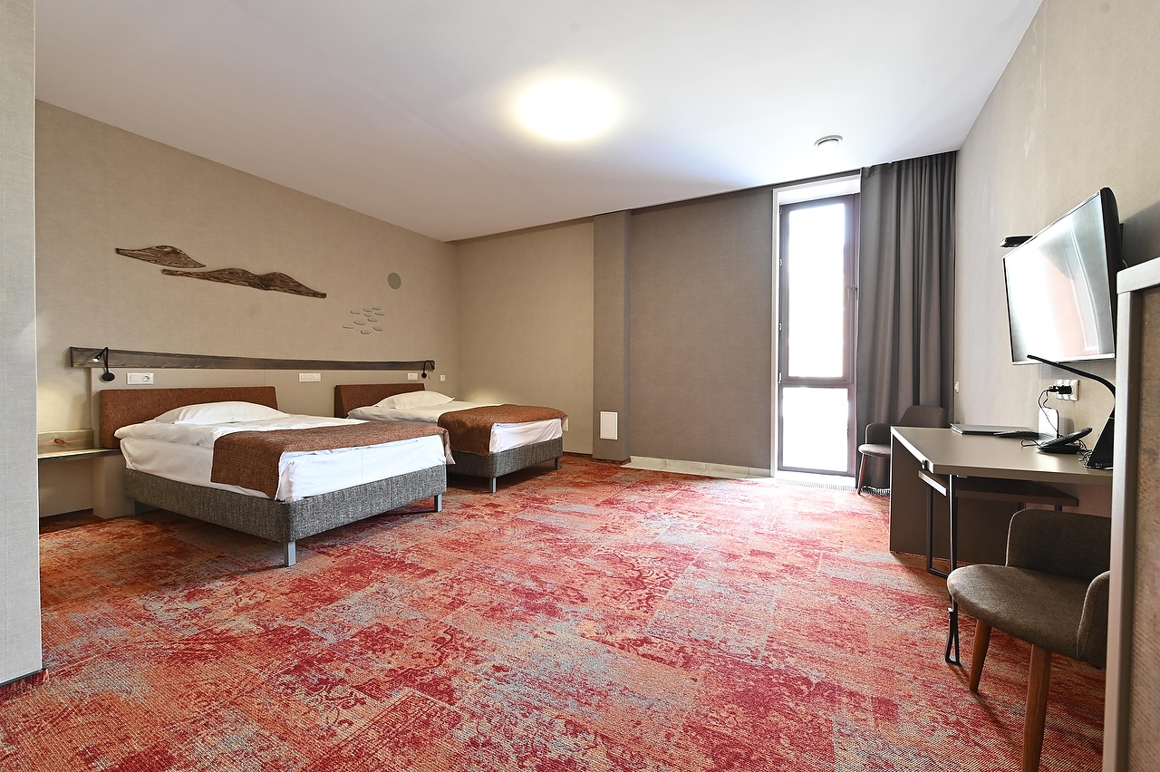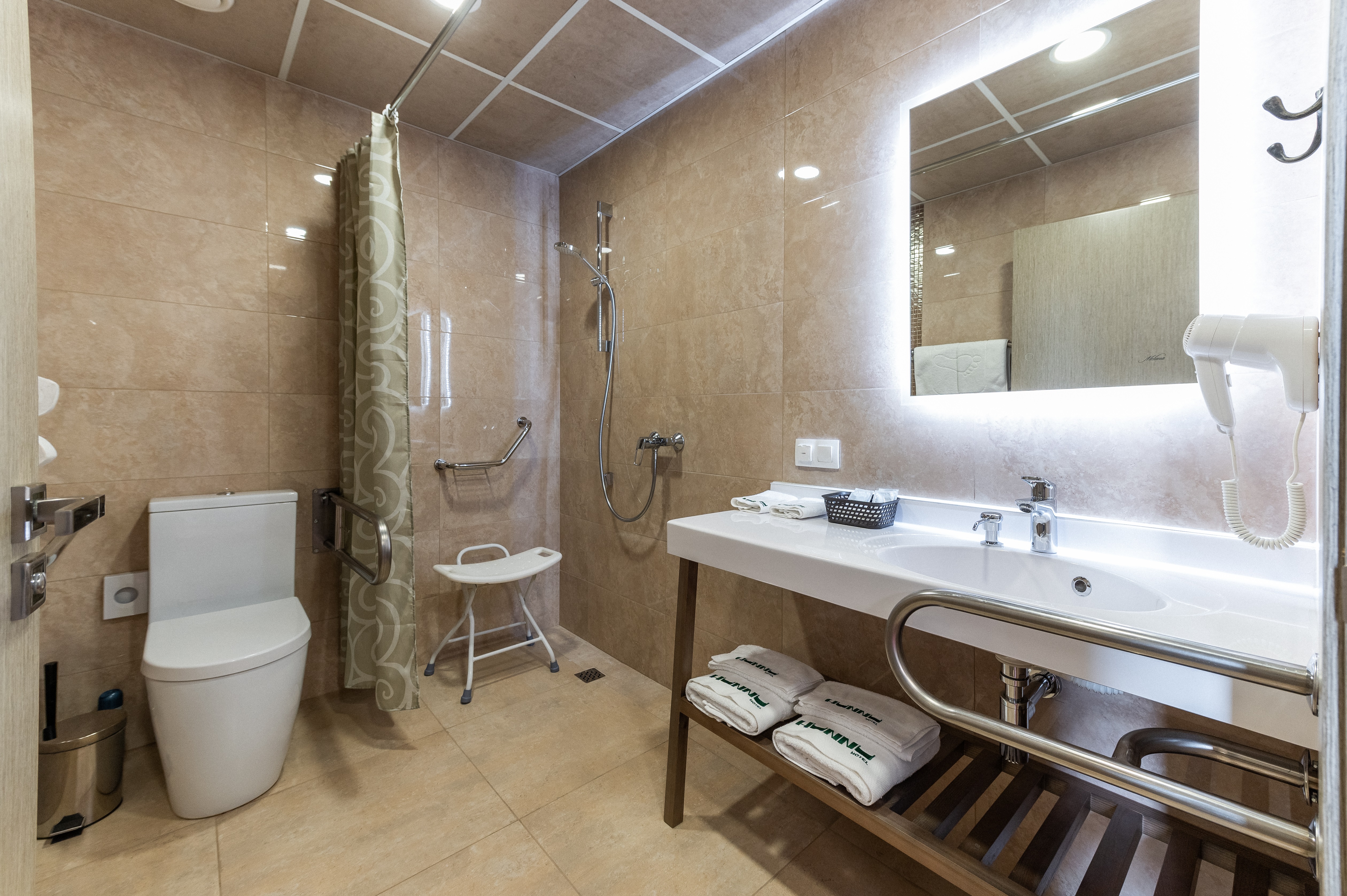 Номер с двумя раздельными кроватями для людей с ОВЗ Номер полностью оборудован для гостей с инвалидностью. Есть пандус, поручень в сан.узле, а также кнопка для вызова персонала. Выполнен в пастельных тонах, как и остальные номера, очень уютный и комфортный.